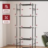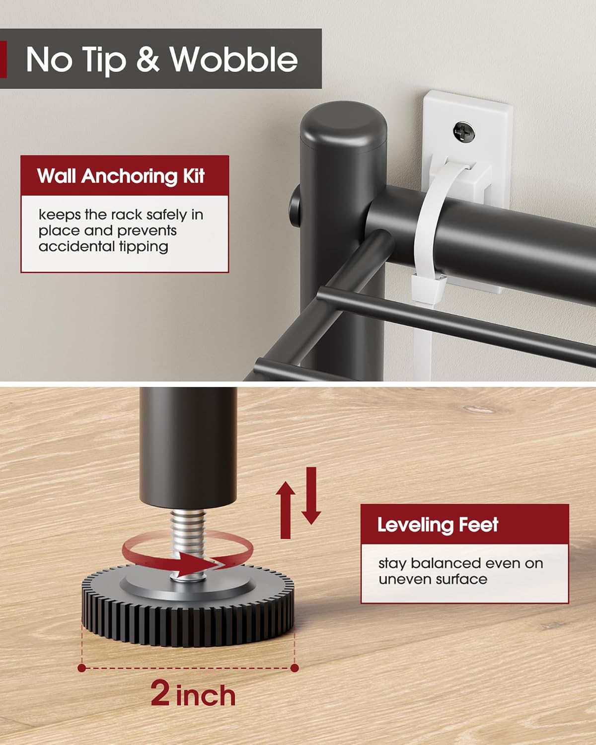 Equipped with leveling feet, this wobble-free rack ensures stability on any surface, giving you peace of mind that your items will stay securely in place. The sleek black finish adds a modern touch to your space, making it not only functional but also stylish.